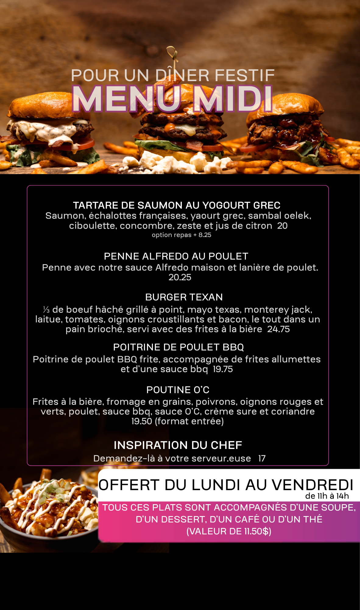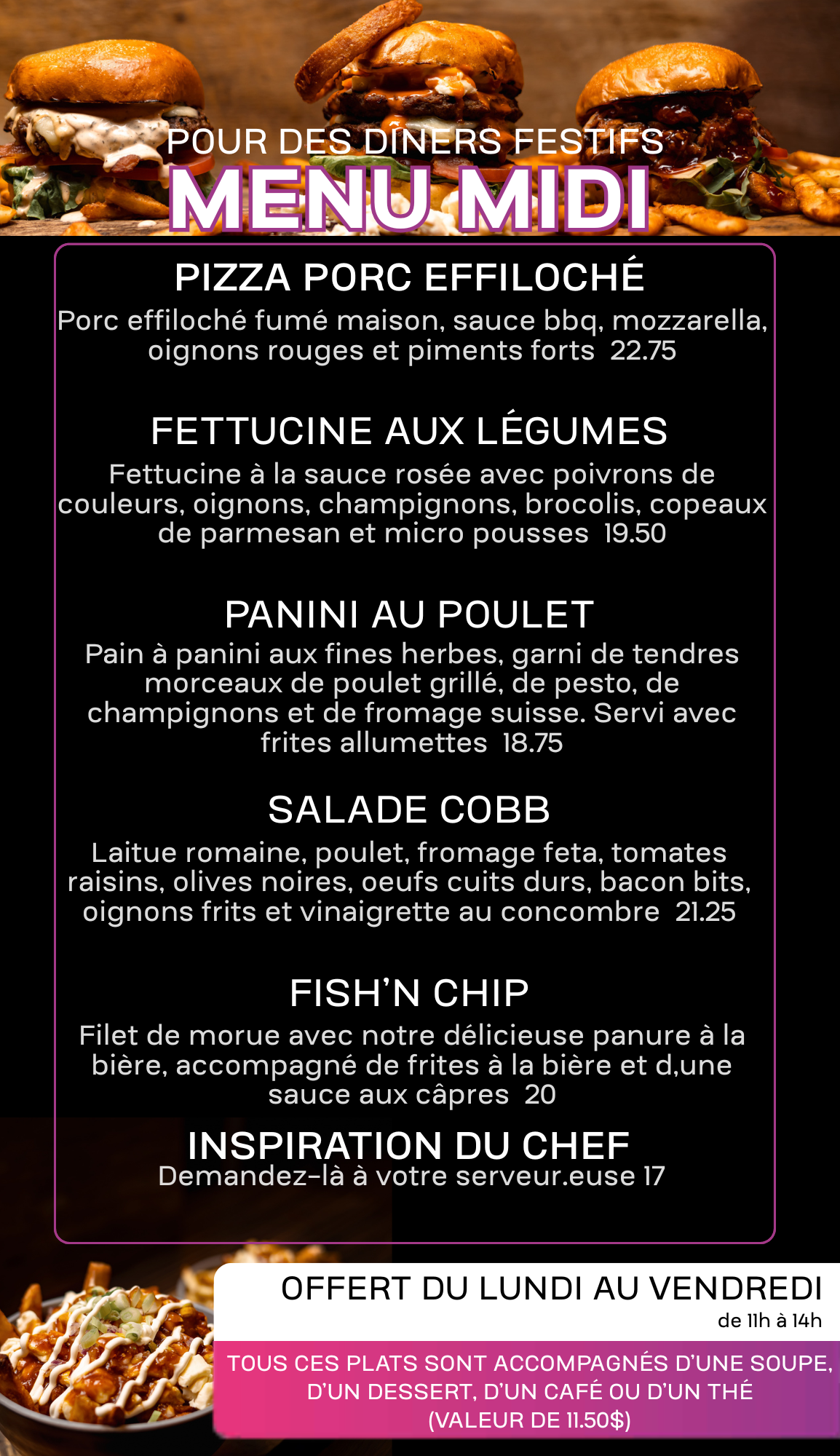 DÎNERS FESTIFS DU LUNDI AU VENDREDI Chaque semaine, nous vous proposons des items de notre menu régulier, ainsi que l'inspiration du chef, offerts en table d'hôte incluant la soupe du jour, un dessert ainsi qu'un café ou un thé. Le tout, d'une valeur de 11.50$.